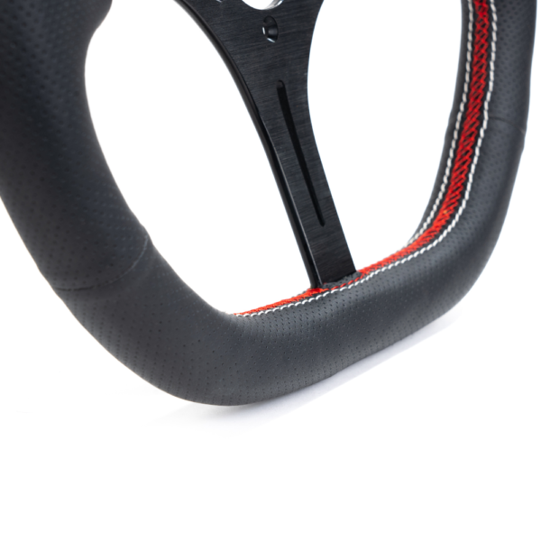 Материалы и конструкция: Рулевое колесо обтянуто перфорированной натуральной кожей, которая обеспечивает отличное сцепление с руками, не скользит даже при интенсивном пилотировании и эффективно отводит влагу. Перфорация также способствует вентиляции, предотвращая перегрев ладоней во время длительных сессий. Каркас выполнен из алюминия с лазерной резкой, что обеспечивает высокую жесткость при минимальном весе (всего 870 г).